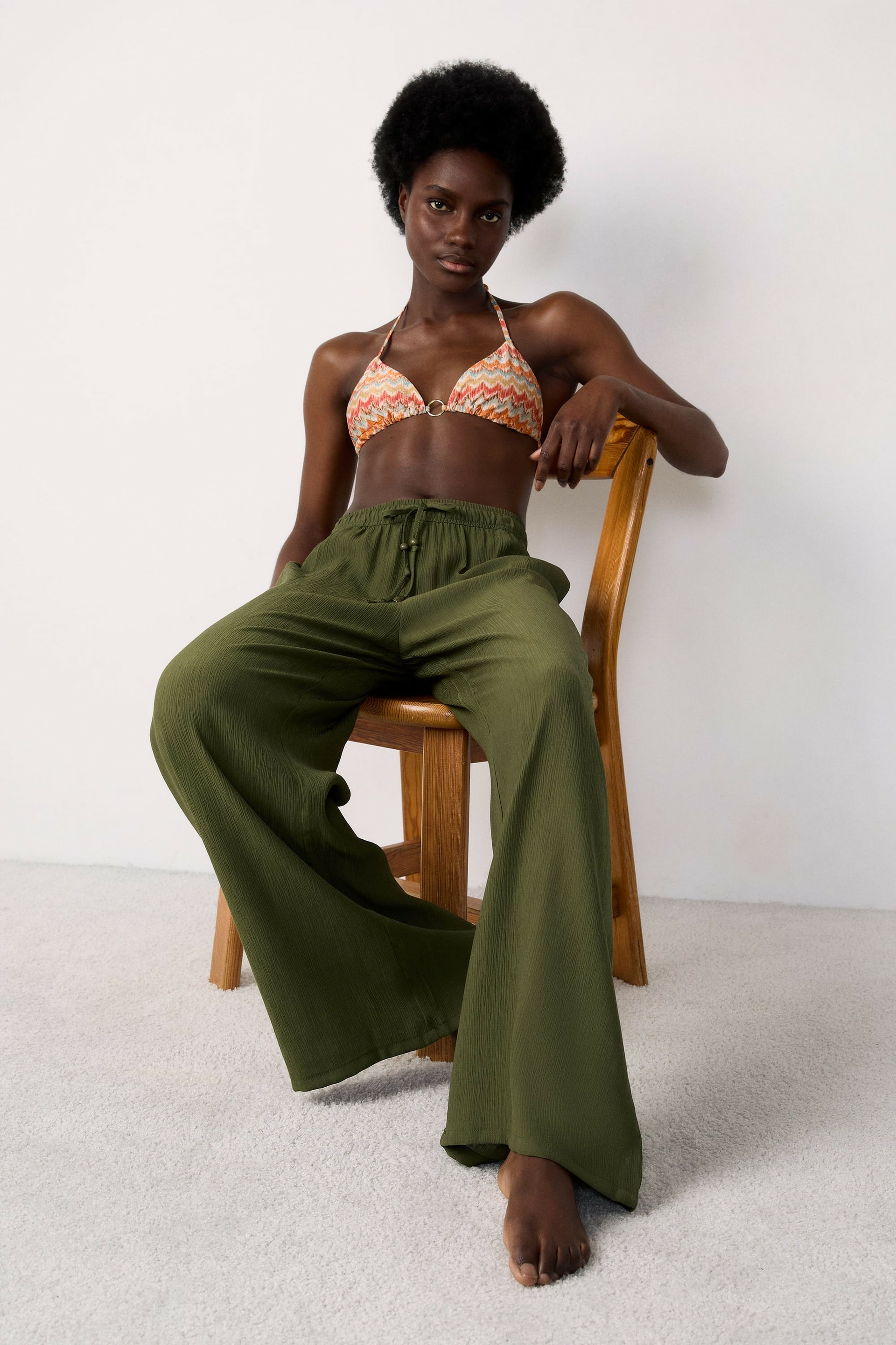 Confectionné dans un tissu aérien, ce pantalon épouse vos mouvements avec douceur tout en offrant une sensation de fraîcheur. Sa coupe fluide et décontractée sublime la silhouette sans jamais la contraindre, parfaite pour une promenade au bord de l’eau ou un brunch en terrasse. Son design épuré se marie facilement avec un top léger ou un maillot de bain, pour un look estival maîtrisé.