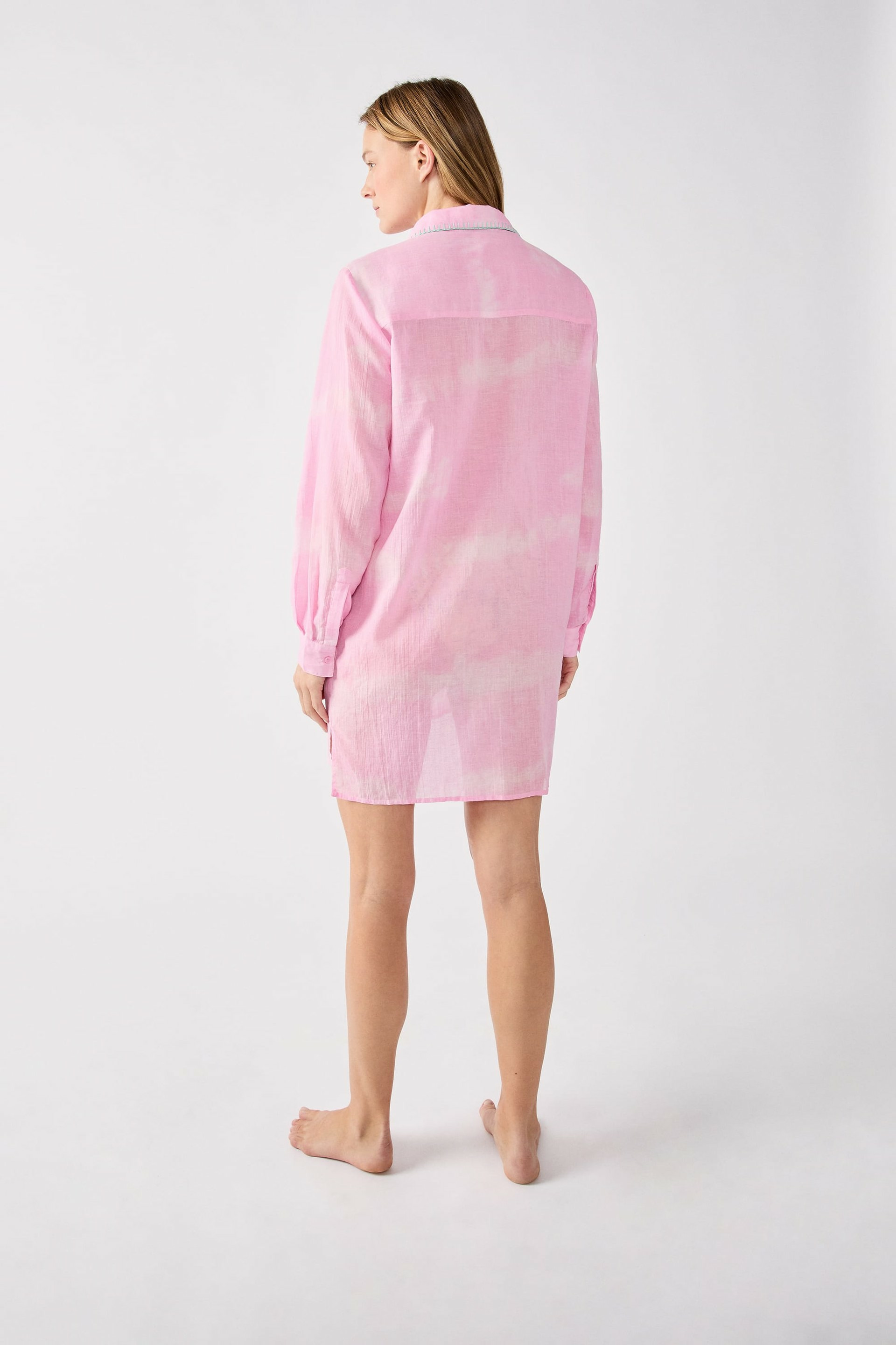Robe chemise en coton 100 % naturel, broderies fines sur le devant, manches longues avec poignets boutonnés, fermeture boutonnée sur toute la longueur, coupe droite légèrement cintrée, longueur genou. Disponible en plusieurs coloris.
