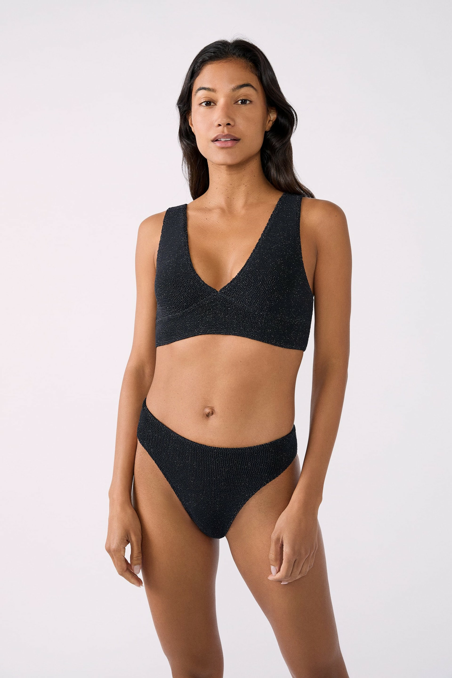 Sublimez votre silhouette avec ce triangle haut de maillot pailleté, conçu pour capturer la lumière et attirer tous les regards. Sa matière extensible épouse parfaitement vos formes pour un maintien optimal et un confort durable.