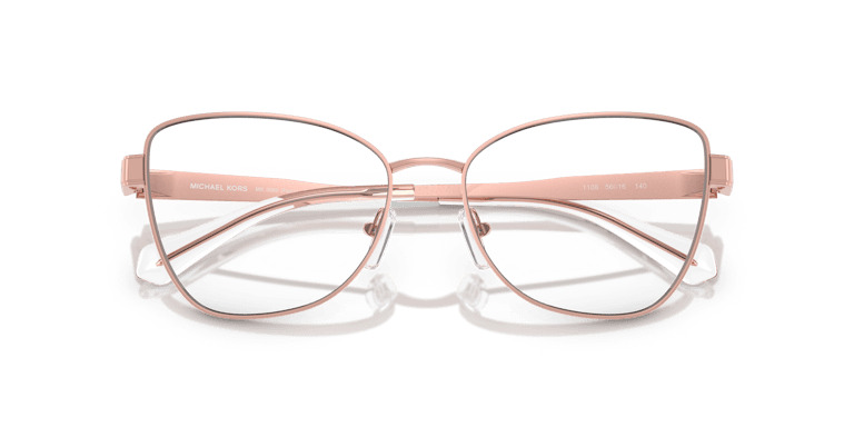 Monture en métal léger, finition argentée, verres rectangulaires légèrement arrondis, dimensions : largeur 140 mm, hauteur 45 mm, branches fines avec logo MICHAEL KORS gravé. Adaptées à la correction optique ou à un usage solaire avec verres teintés.