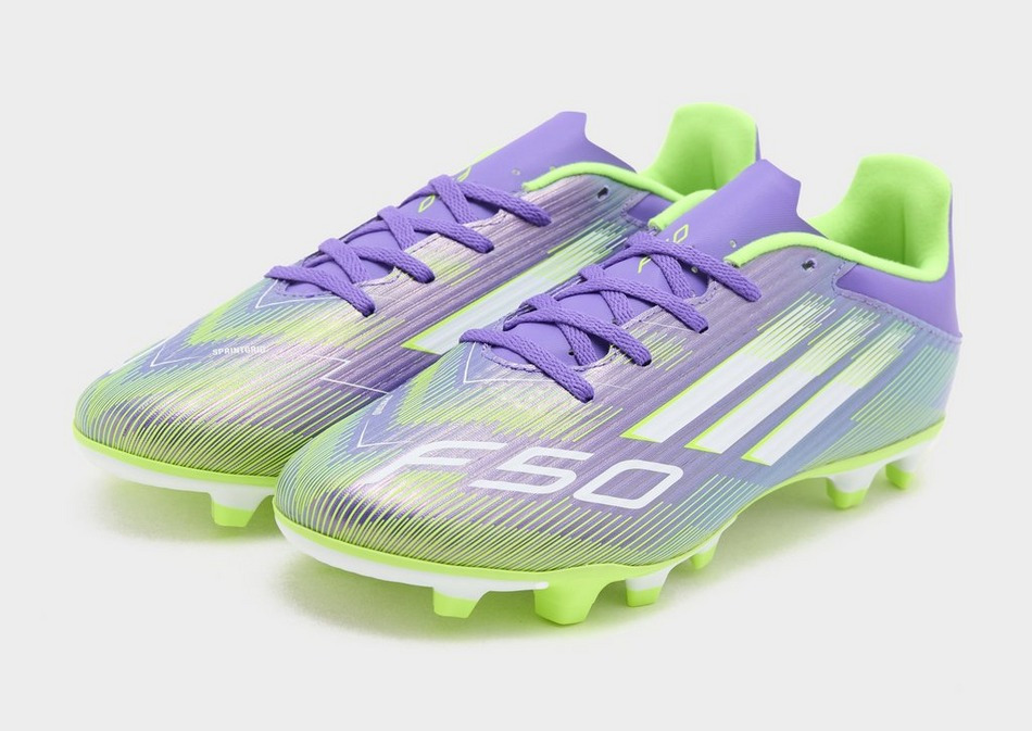 Tige synthétique Fiberskin avec imprimé Sprintgrid, semelle extérieure multi-surfaces en caoutchouc, fermeture à lacets, doublure textile, coloris violet. Adaptée aux terrains souples et gazon synthétique.