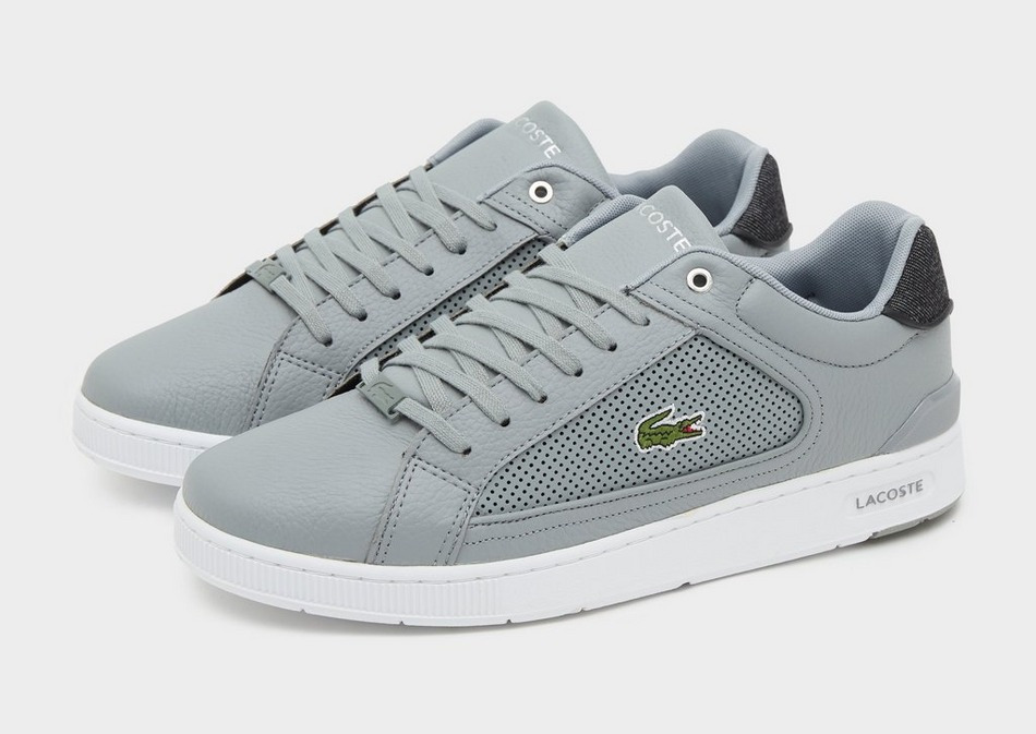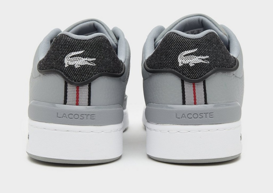 Matière principale en cuir gris, patch en denim noir au talon, perforations sur les côtés, col de cheville rembourré, semelle intermédiaire amortissante, semelle extérieure en caoutchouc antidérapante. Branding Lacoste et logo crocodile distinctifs.