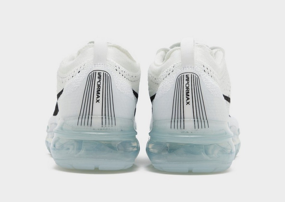 Tige en tissu Flyknit stretch, col sans couture, unité Air VaporMax sur toute la longueur, semelle extérieure en caoutchouc, coloris blanc et Pure Platinum. Code produit JD Sports : 752897.