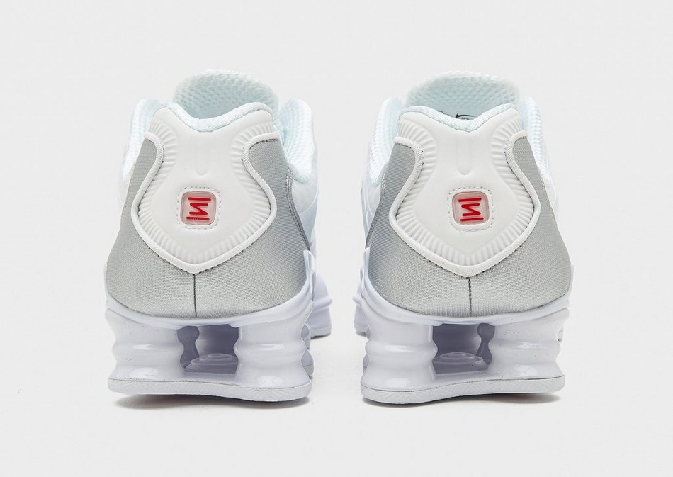 Empeigne en tissu et synthétique avec cage TPU, semelle intermédiaire en mousse, technologie Nike Shox sur toute la longueur, plaque TPU au talon, semelle extérieure en caoutchouc non marquant à motif gaufré modifié. Couleur blanche. Matière principale : cuir synthétique.