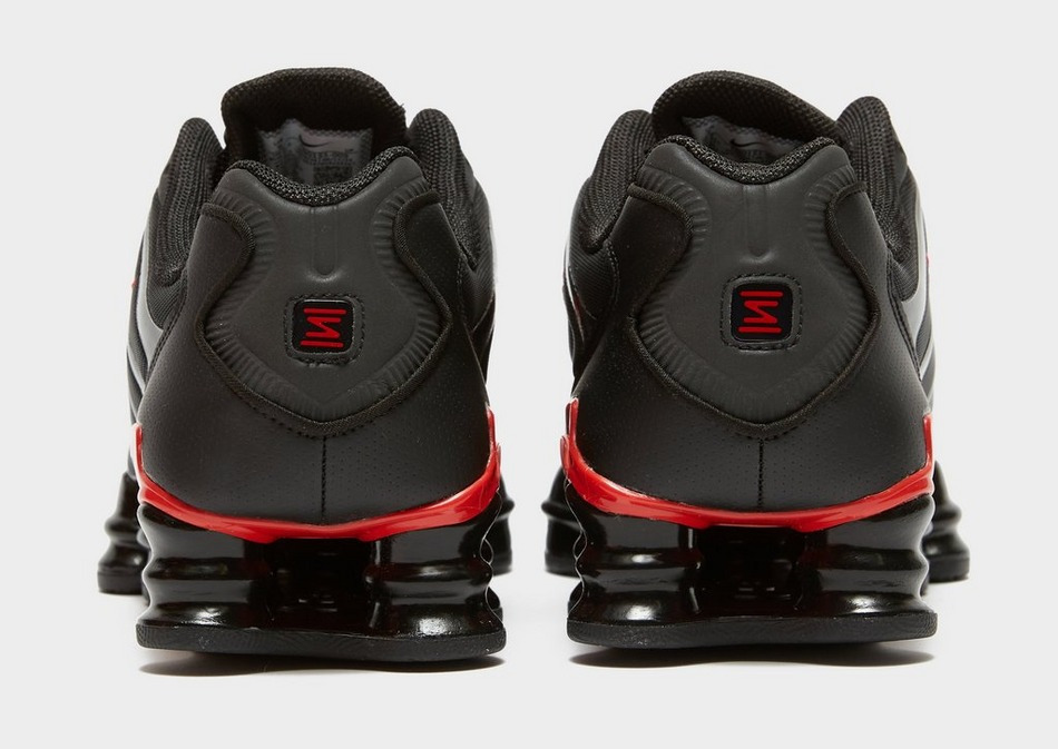 Tige en textile et synthétique, semelle synthétique. Coloris noir avec détails University Red. Semelle intermédiaire profilée avec plaque TPU stabilisante. Technologie Nike Shox visible. Semelle extérieure en caoutchouc. Modèle porté par un mannequin mesurant 1m83 en pointure 44.
