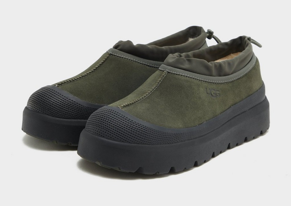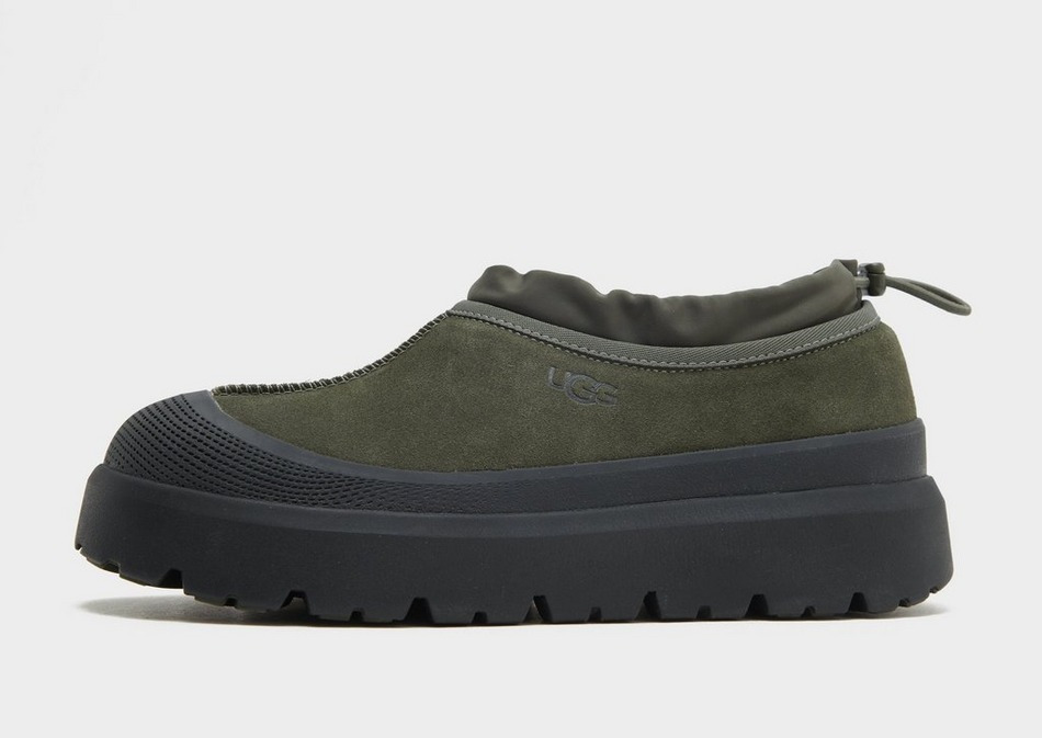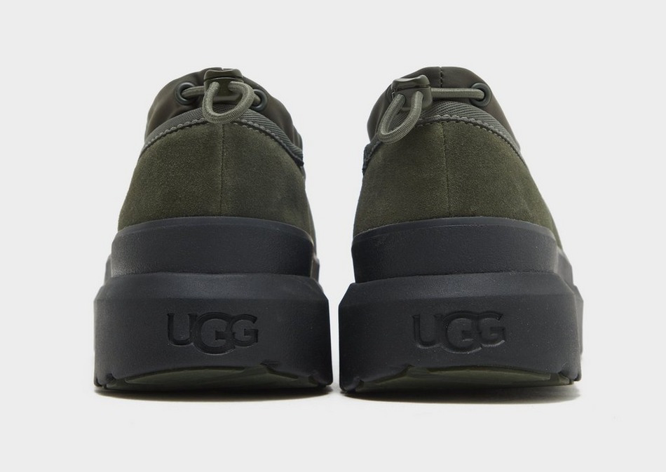Matière : cuir daim imperméable. Couleur : vert Forest Night. Semelle intérieure : laine UGGplush. Semelle extérieure : EVA de canne à sucre pour une traction optimale. Fermeture : col élastique ajustable. Signature : logo UGG sur les flancs.