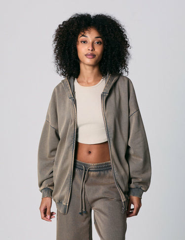 Ce sweat est fabriqué en tissu effet délavé marron clair, avec des finitions côtelées aux poignets et à la base. Il dispose d’une fermeture zippée intégrale, d’une capuche ajustable et de deux poches avant. La coupe oversize assure une silhouette ample et confortable. Référence produit : 33SKY.