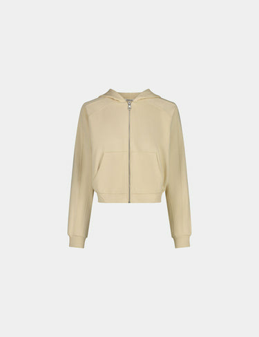 Sweat zippé court à capuche beige clair, 2 poches avant, fermeture zippée intégrale. Coupe courte, matière douce et légère. Photos retouchées pour un rendu fidèle.