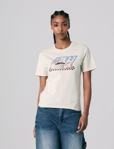 Ce T shirt col rond met en avant une voiture de course imprimée avec précision, pour un look dynamique et moderne. Sa teinte crème apporte une touche de douceur qui équilibre parfaitement l’énergie du motif. Idéal pour booster vos tenues casual tout en affirmant votre personnalité.