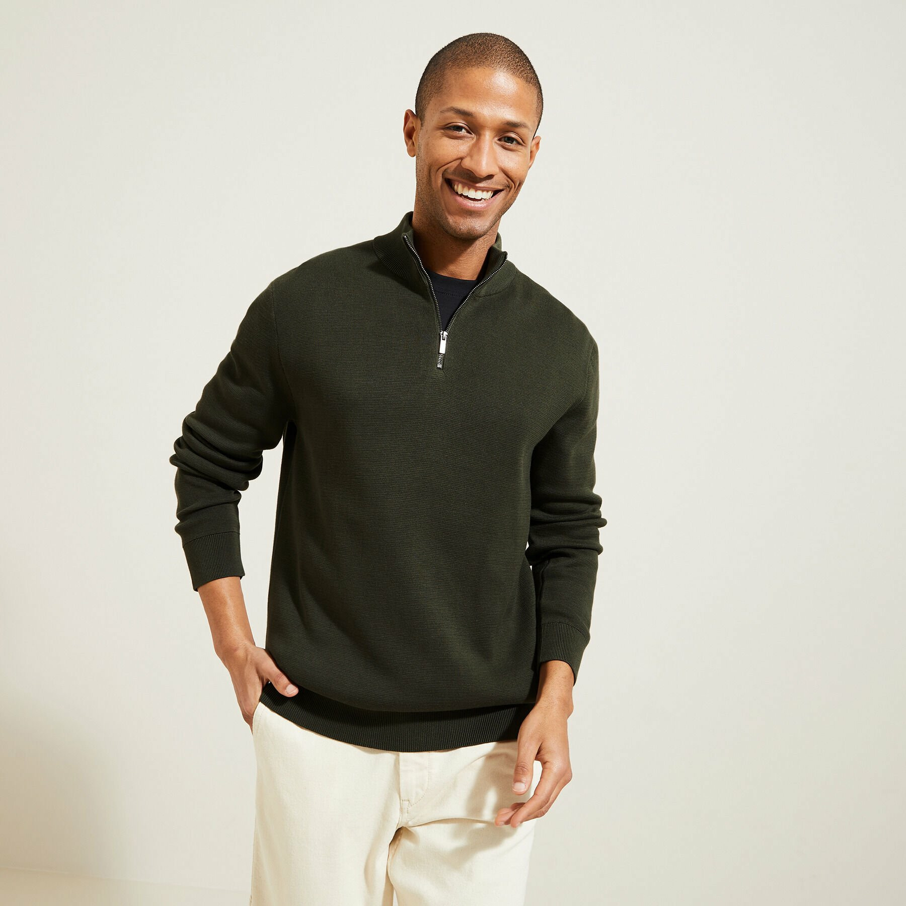Découvrez le pull col montant demi zippé en vert kaki, l'allié parfait pour un style à la fois décontracté et élégant. Sa coupe droite, ni trop ajustée ni trop large, flatte toutes les silhouettes tout en offrant une liberté de mouvement inégalée. Confectionné dans une matière douce et chaude, ce pull vous enveloppe de confort, idéal pour les journées fraîches.