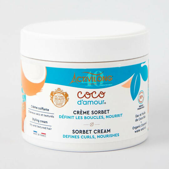 Offrez à vos boucles une hydratation intense et un soin gourmand avec la crème sorbet Coco d'amour d’Activilong. Sa texture légère fond instantanément pour révéler des cheveux doux, souples et parfaitement nourris.