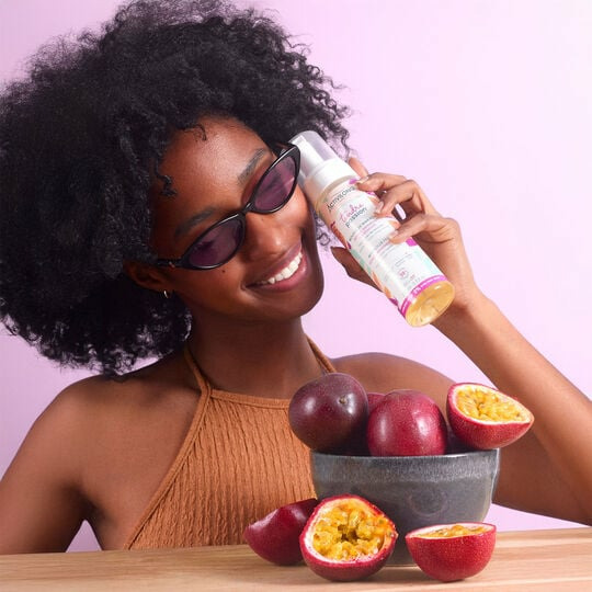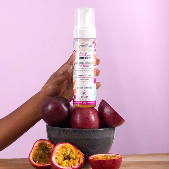 Formulée pour tous types de boucles, la mousse de maracuja Tendre Passion se présente en flacon mousse pratique, facile à doser. Appliquez sur cheveux humides ou secs, puis scrunchez pour activer la forme de vos boucles.