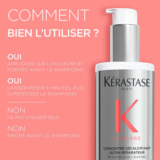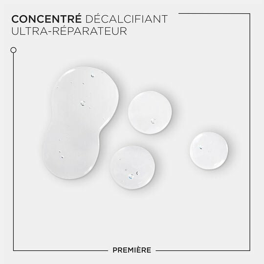 Comment utiliser le Concentré Décalcifiant Ultra-Réparateur Première ? Vaporisez sur cheveux humides avant le shampooing, laissez agir quelques minutes puis rincez.