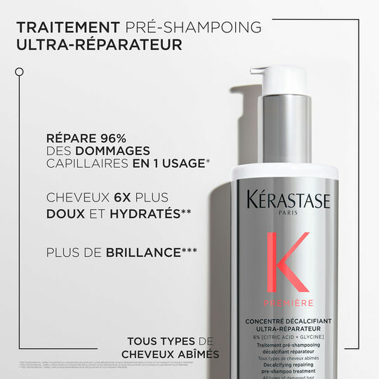 Libérez votre chevelure des impuretés calcaires et révélez une force nouvelle. Le Concentré Décalcifiant Ultra-Réparateur Première de Kérastase transforme votre routine capillaire en un soin expert.