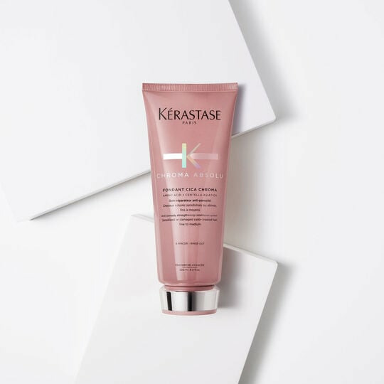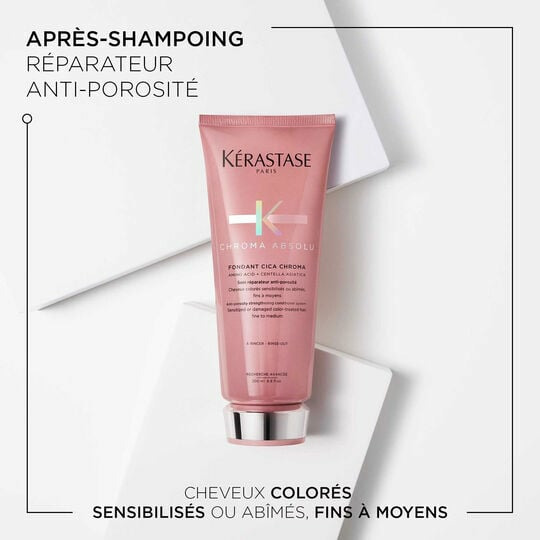 Le Fondant Cica Chroma répare les zones fragilisées, protège contre la décoloration et apporte une sensation de douceur durable. Résultat : des cheveux plus résistants, brillants et parfaitement protégés, même après plusieurs lavages.