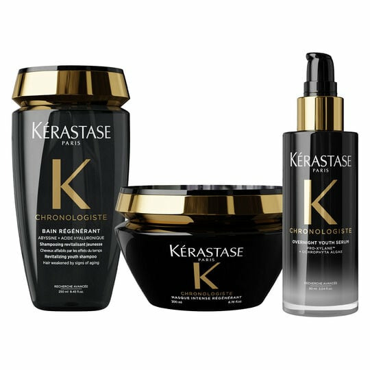 Le bain régénérant nettoie en douceur tout en stimulant la fibre. Le masque intense nourrit profondément pour une réparation visible. Le sérum nuit jeunesse agit pendant le sommeil pour renforcer et revitaliser la chevelure au réveil.