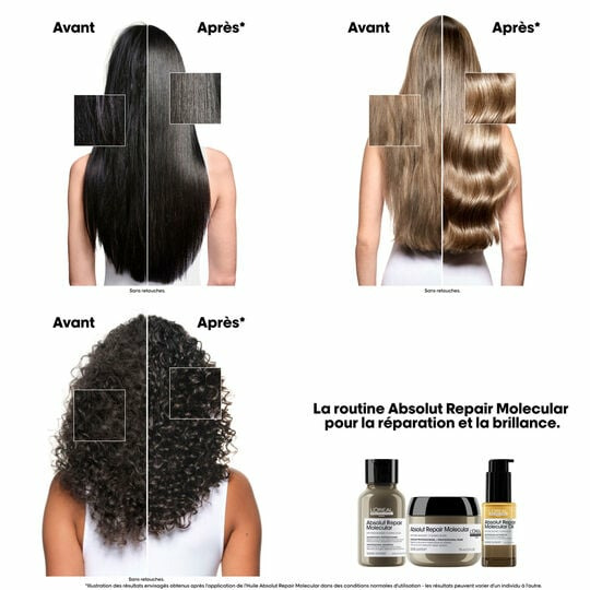 Redonnez vie à vos cheveux abîmés avec l’huile bi-phase Absolut Repair Molecular. Une formule légère qui répare en profondeur tout en sublimant la brillance naturelle de votre chevelure.