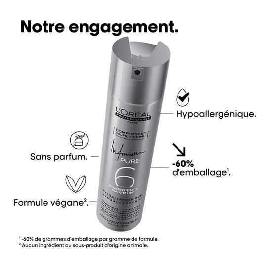 Conditionnée en spray de 300ml, la Laque Infinium Pure fixation souple s’applique facilement à distance pour une diffusion homogène. Sans parfum, elle évite toute irritation ou gêne olfactive, parfaite pour un usage quotidien ou professionnel.