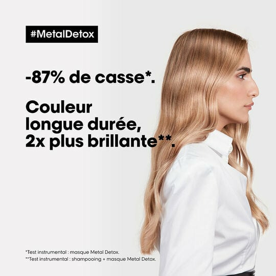 Comment utiliser le masque Metal Detox ? Appliquez une quantité généreuse sur cheveux essorés, laissez poser 5 à 10 minutes, puis rincez abondamment.