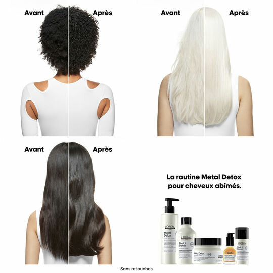 Grâce à Metal Detox, vos cheveux retrouvent force, souplesse et résistance. Ce pré-shampooing réduit la porosité, limite la casse et améliore la tenue de la couleur, pour un éclat durable et une sensation de cheveux plus denses et protégés au quotidien.