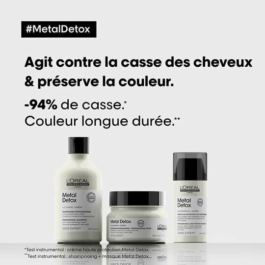 Le rituel se compose de trois crèmes spécifiques à appliquer selon les instructions L’Oréal Professionnel, formulées pour neutraliser les métaux lourds sans agresser la fibre. Adapté à tous types de cheveux colorés, ce soin est le complément idéal pour maintenir une couleur vibrante et un cuir chevelu sain.
