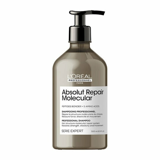 Le shampooing réparateur Absolut Repair Molecular se présente en flacon de 500 ml, idéal pour un usage régulier. Formulé par L’Oréal Professionnel Paris, il convient à tous les types de cheveux sensibilisés, même les plus fragiles.