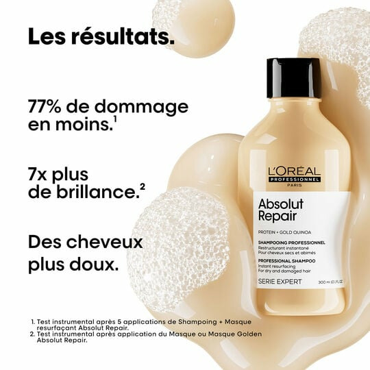 Comment optimiser les résultats du shampooing Absolut Repair ? Pour un soin complet, utilisez-le en association avec le masque ou le sérum de la gamme Absolut Repair.