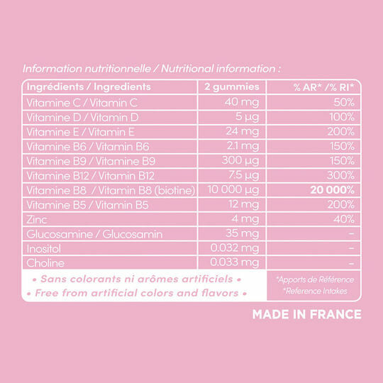 Ces petits bonbons rouges concentrent un cocktail de vitamines essentielles qui stimulent la vitalité et la beauté de votre chevelure. Leur formule savamment dosée agit en profondeur pour renforcer, protéger et sublimer vos cheveux jour après jour. Faciles à intégrer dans votre routine, ces gummies transforment la prise de compléments en un moment plaisir.