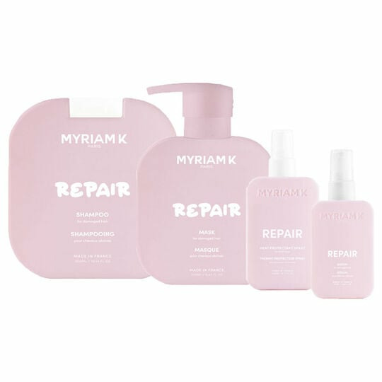 Le rituel réparateur intense Myriam.K Paris convient aux cheveux fragilisés, cassants ou sensibilisés. Utilisez le shampooing pour nettoyer sans agresser, appliquez le masque pour nourrir en profondeur, le soin pour réparer les zones abîmées et terminez par le protecteur pour sceller et préserver la fibre.