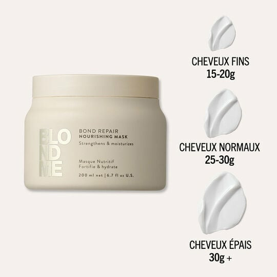 Le masque Blondme Bond Repair s’applique après le shampooing sur cheveux essorés. Laissez poser quelques minutes avant de rincer soigneusement. Sa formule riche en agents nutritifs pénètre rapidement sans alourdir la chevelure.