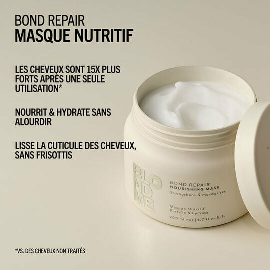 Offrez à vos cheveux blonds une cure de force et d’éclat inégalée. Le masque nutritif Blondme Bond Repair transforme la fibre capillaire abîmée en une matière saine et lumineuse.