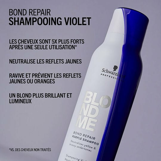 Comment utiliser le rituel Blondme Bond Repair ? Appliquez le soin violet sur cheveux lavés et essorés, laissez poser selon les instructions, puis rincez abondamment.