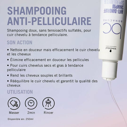 Dites adieu aux pellicules tenaces et retrouvez un cuir chevelu sain et équilibré. Le shampooing anti-pelliculaire BC Scalp de Schwarzkopf Professional agit en profondeur pour purifier et apaiser votre cuir chevelu.