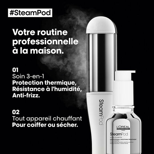 Le soin 3-en-1 SteamPod se présente sous forme d’un fluide léger, facile à appliquer avant le coiffage. Compatible avec l’utilisation du lisseur SteamPod, il optimise la performance du lissage tout en renforçant la fibre capillaire.