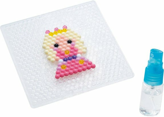 Comment fonctionne Aquabeads Le Carrosse Enchanté ? Assemblez les perles sur le canevas, vaporisez d’eau, laissez sécher, puis détachez votre création.