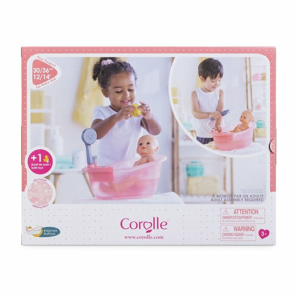 Réponse : La baignoire Corolle avec une partie amovible, une douchette flexible et un canard jaune. Le poupon est vendu séparément.
