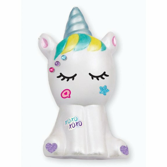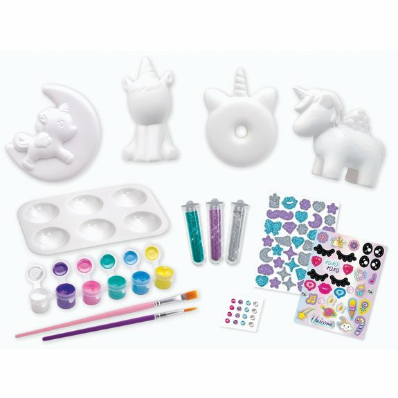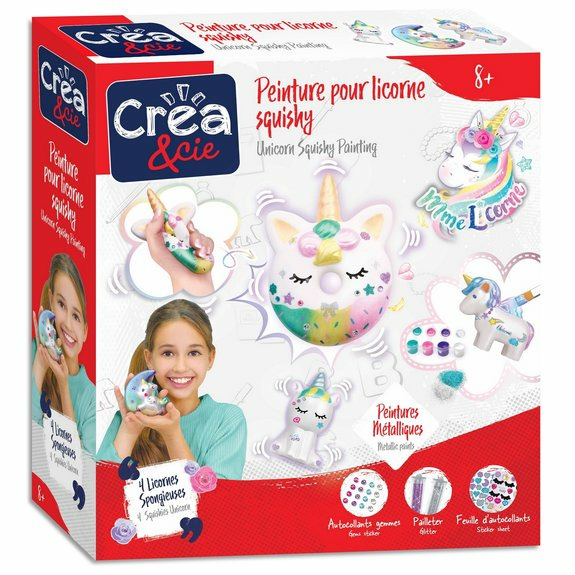 Le kit comprend une licorne squishy blanche prête à peindre, un set de peintures adaptées, des pinceaux et un guide pas à pas pour accompagner chaque étape de la création.