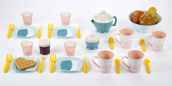 Le coffret comprend plusieurs accessoires de petit-déjeuner aux teintes vert azur. Attention, les couleurs et détails peuvent varier légèrement par rapport au modèle présenté sur la boîte. Le jouet nécessite un montage préalable par un adulte responsable. Pour éviter tout risque, retirez tous les éléments d’emballage non destinés au jeu.