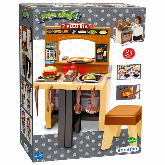 Dimensions et contenu : la pizzeria Ecoiffier comprend 32 accessoires variés, un four, un évier, une plaque de cuisson, un passe-plat, une table, des tabourets, un menu et un espace encaissement avec carte de crédit. Convient aux enfants dès 18 mois. Fabriqué en France.