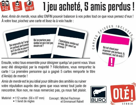 Avec Amis de merde, attendez-vous à des moments intenses, drôles et parfois gênants, qui renforceront ou mettront à rude épreuve vos relations. Idéal pour animer vos réunions de famille, soirées entre amis ou rencontres, il garantit une ambiance électrique et mémorable.