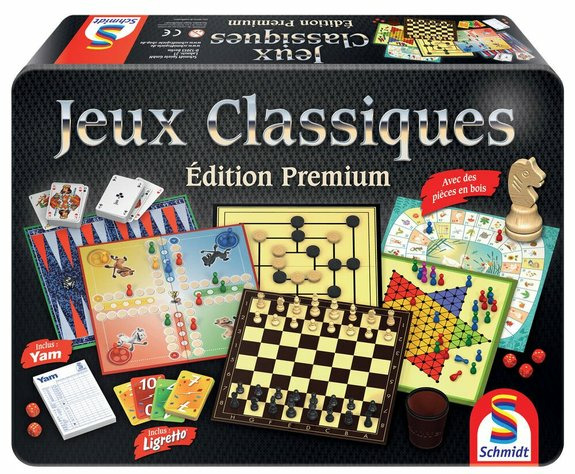 Ce coffret élégant rassemble l’essentiel des jeux classiques : trois plateaux double face pour varier les plaisirs avec le jeu de l’oie, les petits chevaux, les échecs et les dames. Complété par un bloc de yam, un jeu de cartes, un Ligretto et un gobelet à dés, il promet des heures de challenge et de rires en famille ou entre amis. Son design soigné et sa boîte métallique robuste en font un objet à la fois pratique et esthétique, facile à transporter et à conserver.