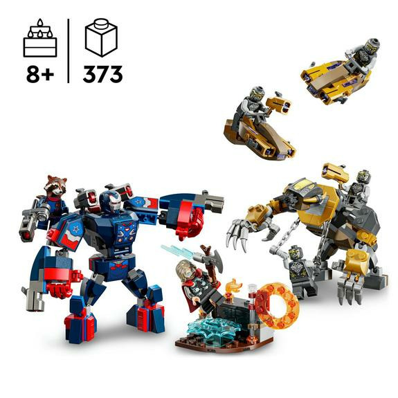 Le set comprend 373 pièces. L’armure robot Iron Patriot mesure plus de 10 cm de haut, tandis que le gorille Chitauri atteint plus de 10 cm de long. Le coffret inclut 7 minifigurines, 2 scooters volants, un décor pour Thor et plusieurs accessoires, dont des lance-tenons.