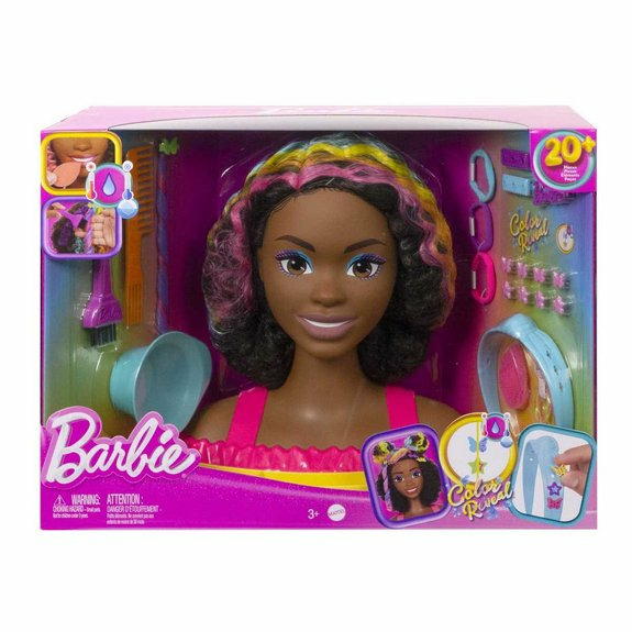 Marque : Mattel. Contenu : tête à coiffer brune avec mèches arc-en-ciel, 22 accessoires Color Reveal, boîte à compartiments intégrée. Existe également en version blonde.