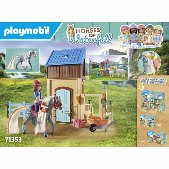 Le set Amélia et Whisper avec box pour chevaux Playmobil Horses of Waterfall 71353 comprend : une figurine Amélia, un cheval Whisper avec crinière et queue coiffables, un box, un enclos, un alpaga et son petit, un poulain, un chien, ainsi que de nombreux accessoires pour enrichir le jeu.