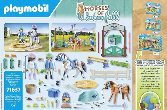 Fabriqué à partir de plus de 80 % de matériaux recyclés et biosourcés, cet ensemble s’inscrit dans une démarche responsable. Il comprend des figurines Owen et Zoe, un cheval, un cheval en bois, un rail transparent, ainsi que tout l’équipement nécessaire pour les exercices et soins.