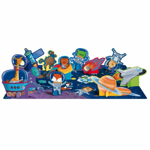 Contenu : 1 livre de 10 pages, 1 puzzle de 40 pièces, 10 éléments spatiaux à emboîter. Marque : Sassi.