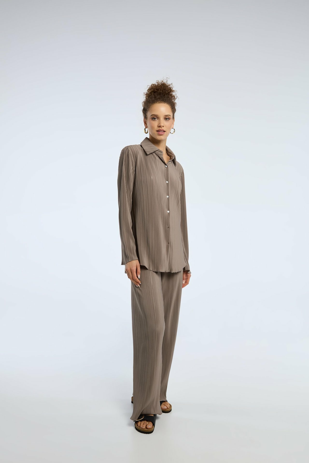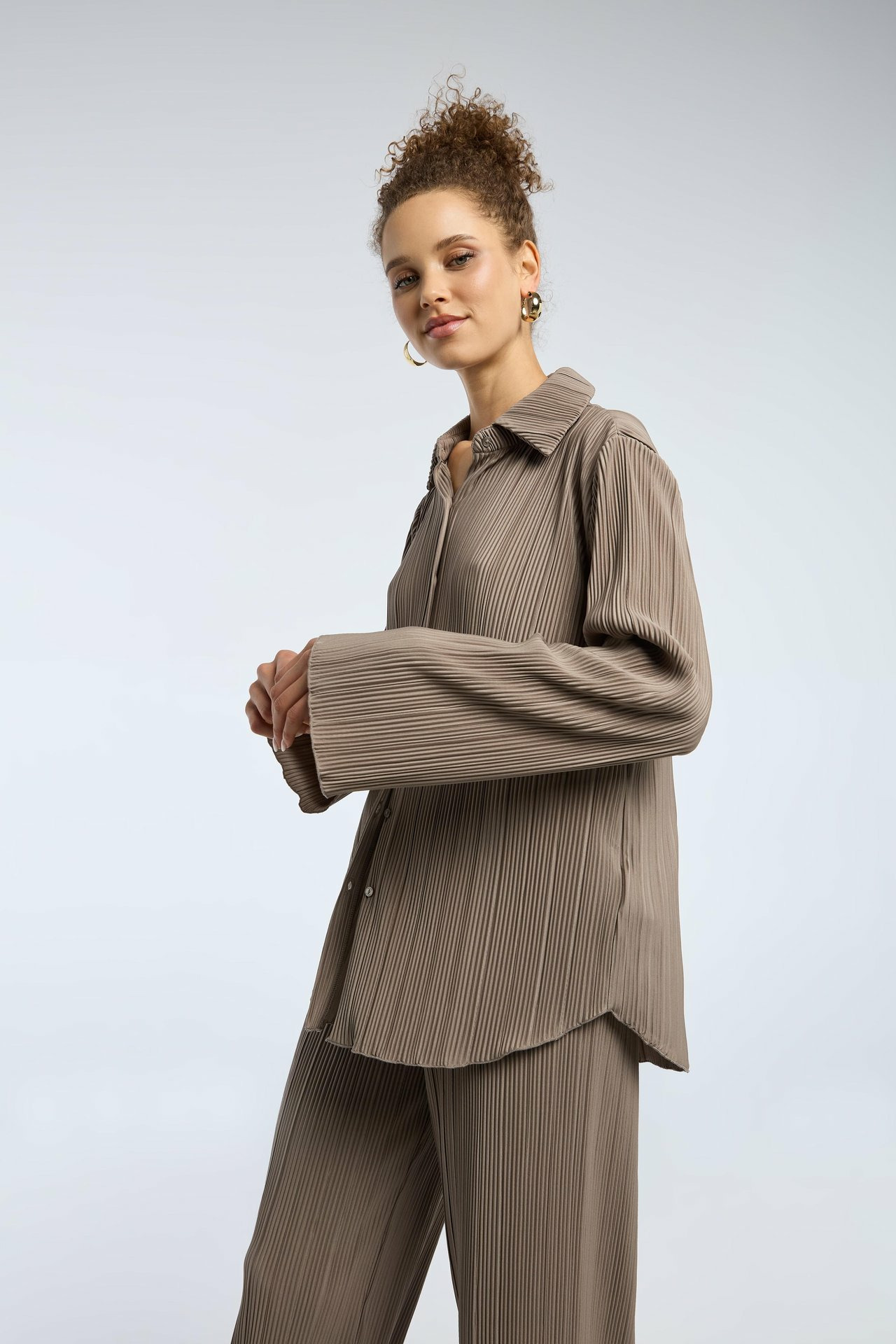 Réponse : La blouse est confectionnée dans un tissu léger et fluide, garantissant confort et élégance.