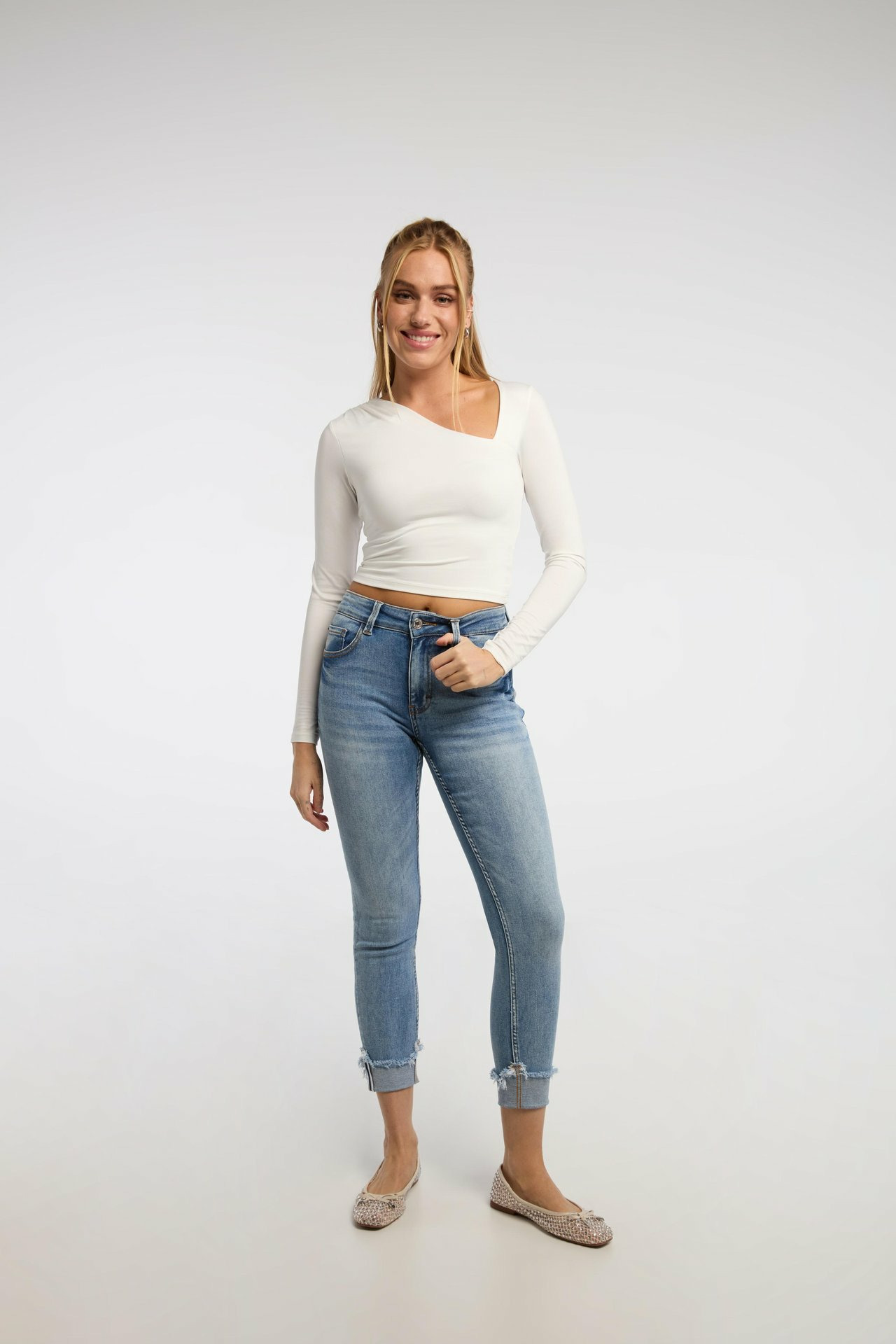 Réponse : Sa coupe slim et sa taille mi-haute conviennent à la majorité des silhouettes, mettant en valeur la taille et allongeant la jambe.