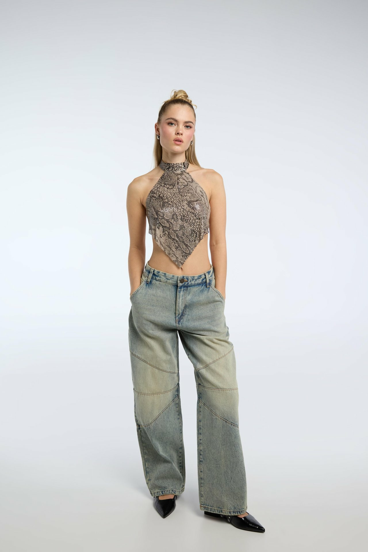 Fabriqué en denim robuste, ce jeans baggy présente une taille mi-haute avec fermeture zippée et boutons, ainsi que des poches fonctionnelles pour un usage pratique. Sa finition soignée garantit une tenue durable et facile à assortir.