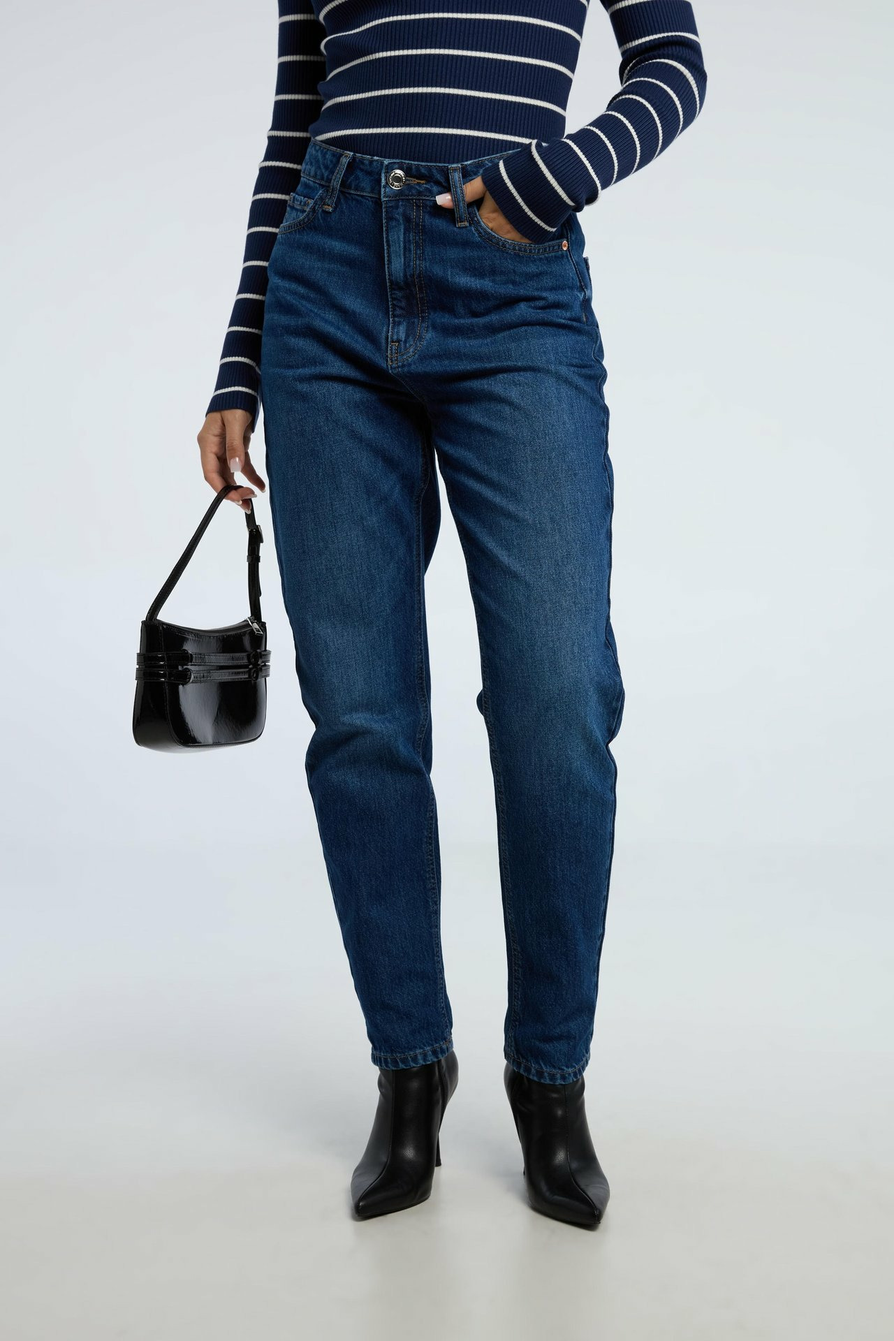 Fabriqué en denim 100 % coton, ce jeans mom fit présente une coupe droite légèrement resserrée aux chevilles, une taille haute avec passants pour ceinture, ainsi que des poches avant et arrière fonctionnelles.